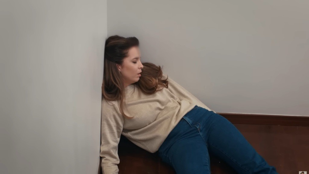 Spada na półpiętro, uderzając głową o ścianę. Jej ciało bezwładnie osuwa się na stopnie.