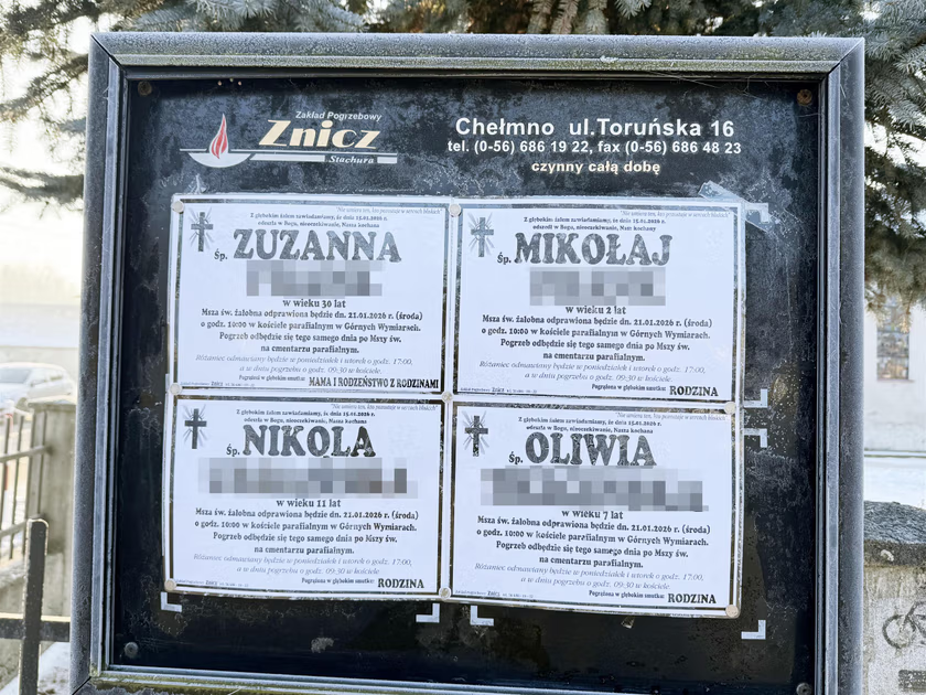 To był jeden z najsmutniejszych dni w historii niewielkiej miejscowości Górne Wymiary w woj. kujawsko-pomorskim. W środę, 21 stycznia, w tamtejszym parafialnym kościele odbył się pogrzeb 30-letniej Zuzanny F. i jej trójki dzieci: Nikoli (†11 l.), Oliwii (†7 l.) i maleńkiego Mikołaja (†2 l.). Rodzina zginęła tragicznie w wyniku zatrucia tlenkiem węgla.
