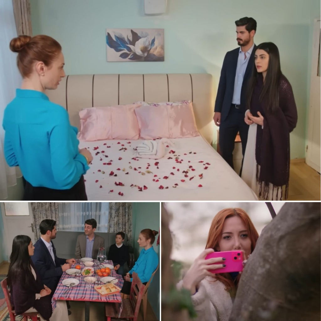 Cihan i Hancer wciąż są zamknięci w starym domu. Cisza, ciężka i duszna, wypełnia salon, przerywana jedynie suchym stukotem klawiszy laptopa. Cihan siedzi na jednej z kanap, pochylony nad ekranem, skupiony, jakby praca była jedynym sposobem, by nie patrzeć na kobietę naprzeciwko.Hancer siedzi na drugiej kanapie. Ma dłonie splecione na kolanach, plecy wyprostowane, a spojrzenie spuszczone. Jej sweter miękko opada na ramiona – wykonany na szydełku, misterny, pełen detali. Pastelowe odcienie błękitu, beżu, szarości i przygaszonego różu splatają się w geometryczne, niemal mandalowe wzory. Na środku piersi dominuje okrągły motyw, przypominający rozetę lub słońce zamknięte w koronce – warstwa na warstwie, jak emocje, których nigdy nie wypowiedziała na głos. Rękawy są luźne, długie, zakończone delikatnymi prześwitami, jakby sweter był jednocześnie tarczą i odsłonięciem duszy.