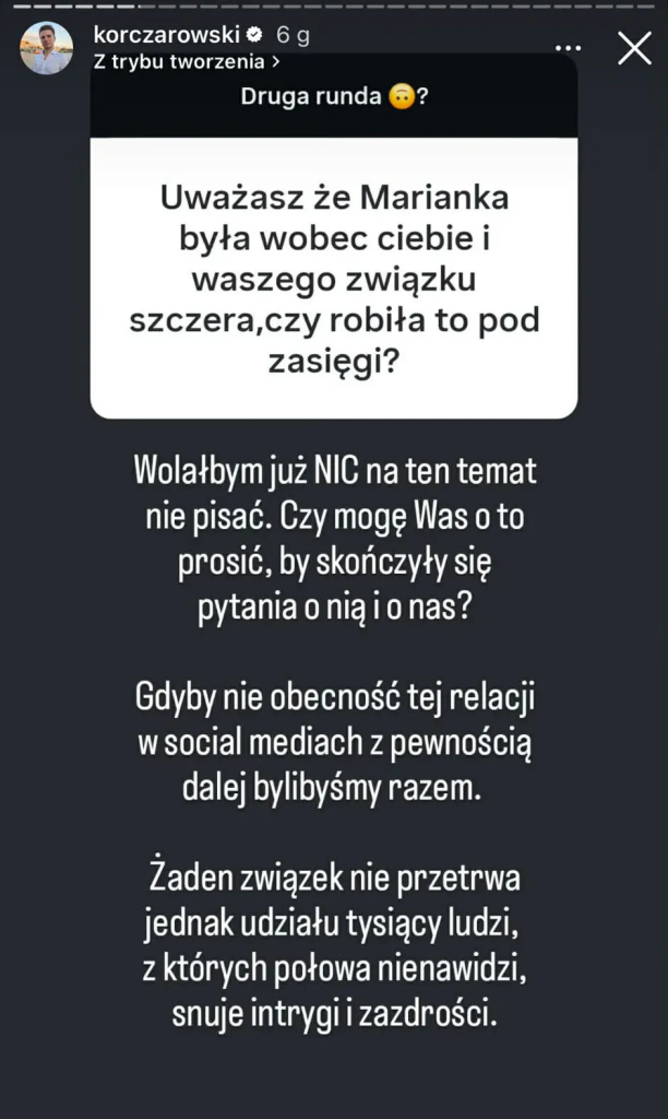 Internauci szczerze zainteresowani życiem uczuciowym naszych wyznawców tradycyjnego systemu wartości postanowili zaczerpnąć informacji u źródła. W związku z tym Piotr Korczarowski został zalany pytaniami o swoją byłą już ukochaną. Jedno z nich dotyczyło sugerowanego robienia zasięgów przez Mariannę na ciągłym upublicznianiu związku.